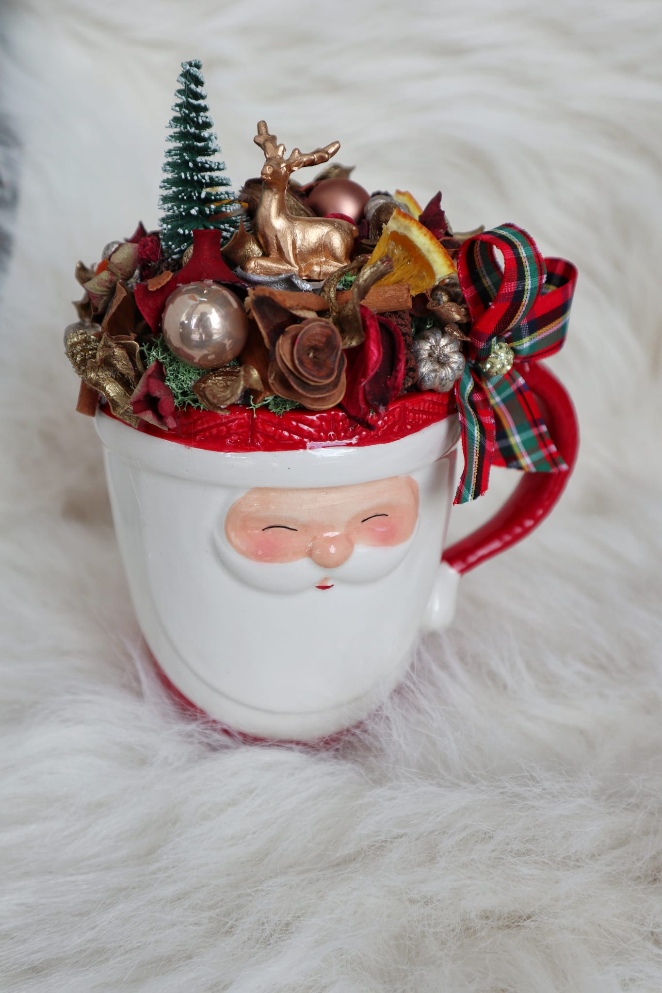 Orice gest sau mică atenție e bine venit, mai ales când e vorba despre Crăciun. Aceste aranjament e realizat din plante uscate și figurină în formă de ren auriu cu tematică de Crăciun, toate asortate cu o fundă din panglică în carouri, într-o cană ceramică simpatică cu model de moș Crăciun.
