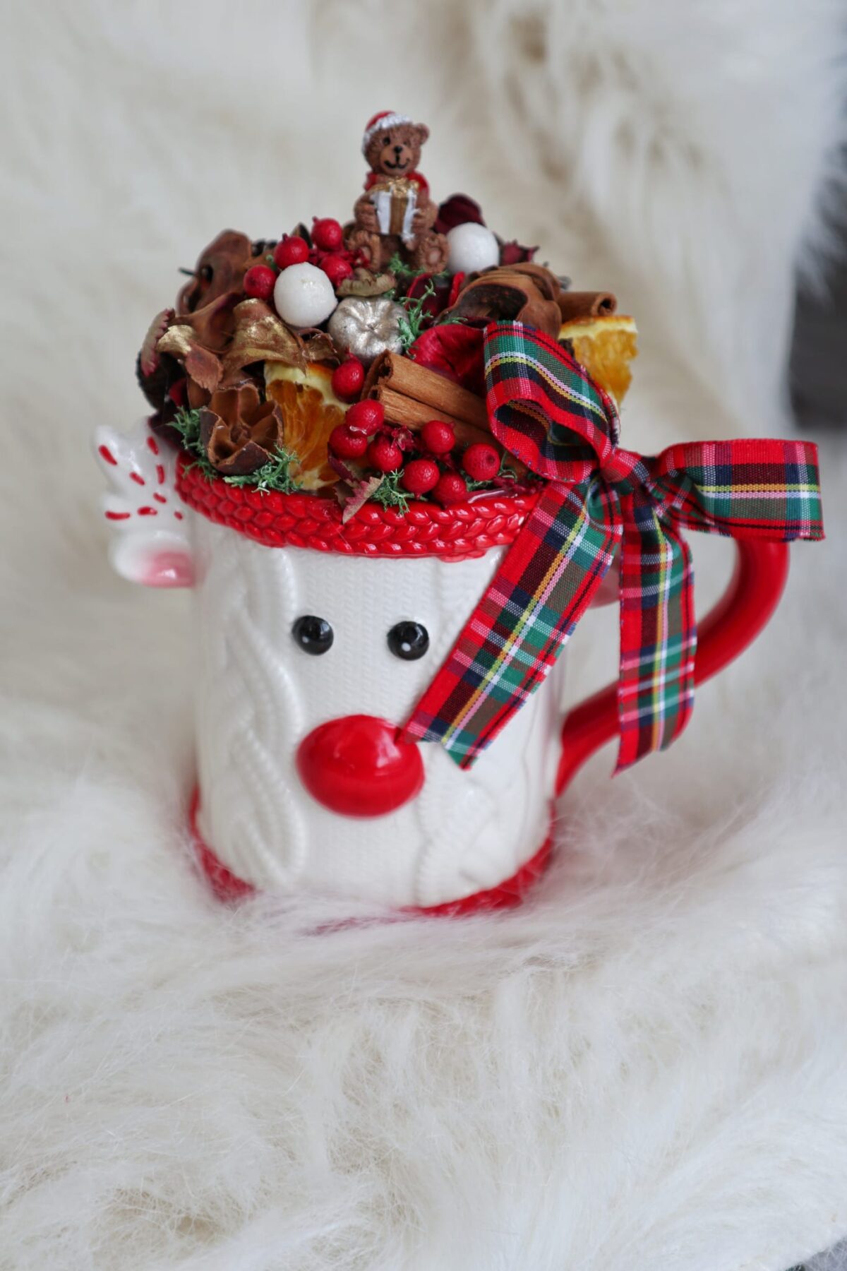 Orice gest sau mică atenție e bine venit, mai ales când e vorba despre Crăciun. Aceste aranjament e realizat din plante uscate și figurină în formă de ursuleț cu tematică de Crăciun, toate asortate cu o fundă din panglică în carouri, într-o cană ceramică simpatică cu model de ren.