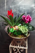 Acest aranjament gingaș format din 4 feluri de plante este un cadou minunat pentru mame, soții, bunica etc. Aranjamentul este creat într-o ghiveci elegant de culoare gri și o drăgălașă figurina Bambi somnoroasa.