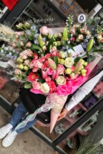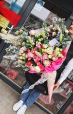 Acest buchet contine Trandafiri, Delphinium, trandafiri spray, Crini ,Pampas,Eucalipt Eustoma etc.