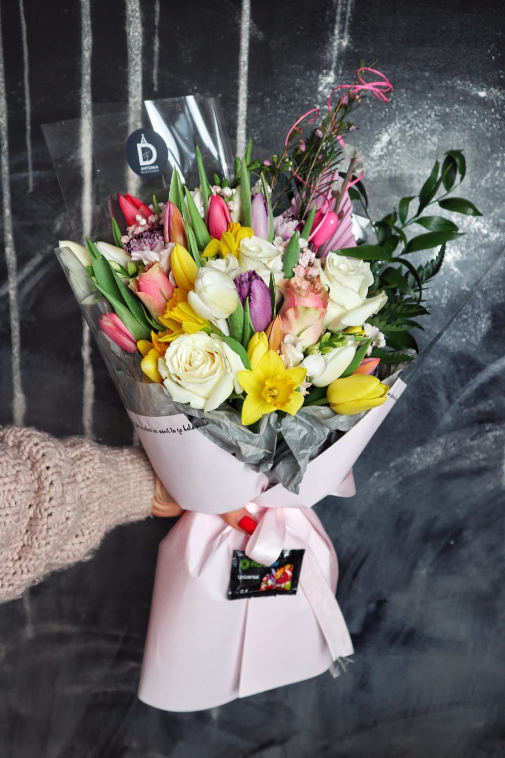 Acest buchet din flori mixte contine lalele, narcise, trandafiri si frezii.