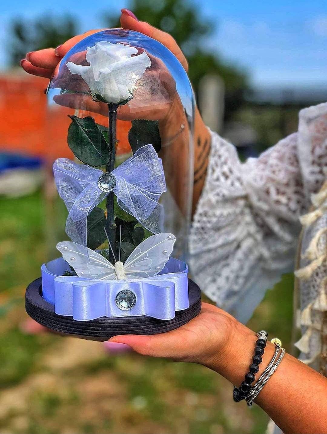 • In cazul in care ati ales sa achizitionati o cupola cu trandafiri criogenati, aceasta va proteja integritatea trandafirului fata de umiditate si praf.