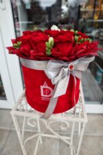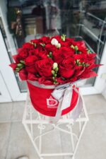 Clasicul trandafir roșu este o alegere ideală atunci când dorești să îți exprimi iubirea nemărginită față de persoana iubita. Acesta semnifică iubirea pură și cu patos și este cel mai reprezentativ gest de iubire. Această cutie are pe lângă trandafiri, frezii albe, reprezentând puritatea gestului de a dărui din suflet acest aranjament. Aceste minunate flori sunt așezate într-o cutie elegantă, de culoare roșu aprins din material catifelat.
