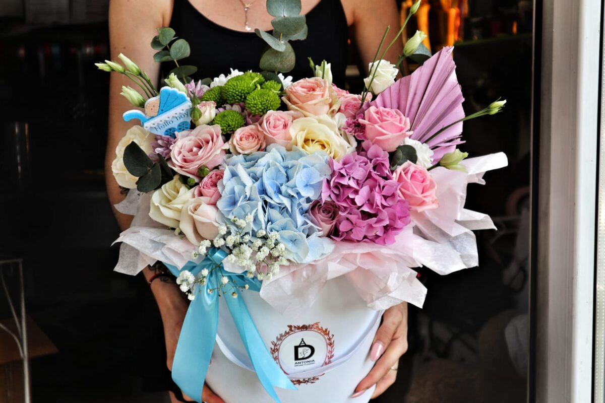 Cutie flori naturale cu hortensie albastra si roz si flori mixte