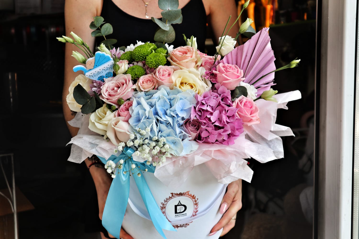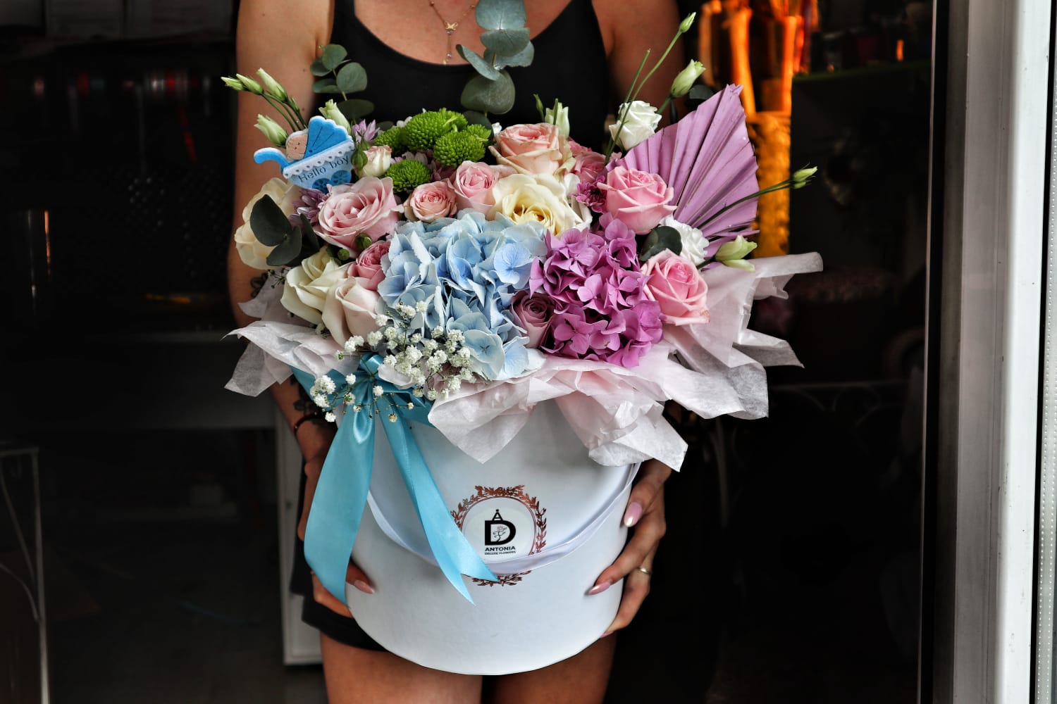 Alege să aduci bucurii cu o cutie elegantă albă ce conține: hortensie albastră, hortensie roz, trandafiri, frezie și eustoma!