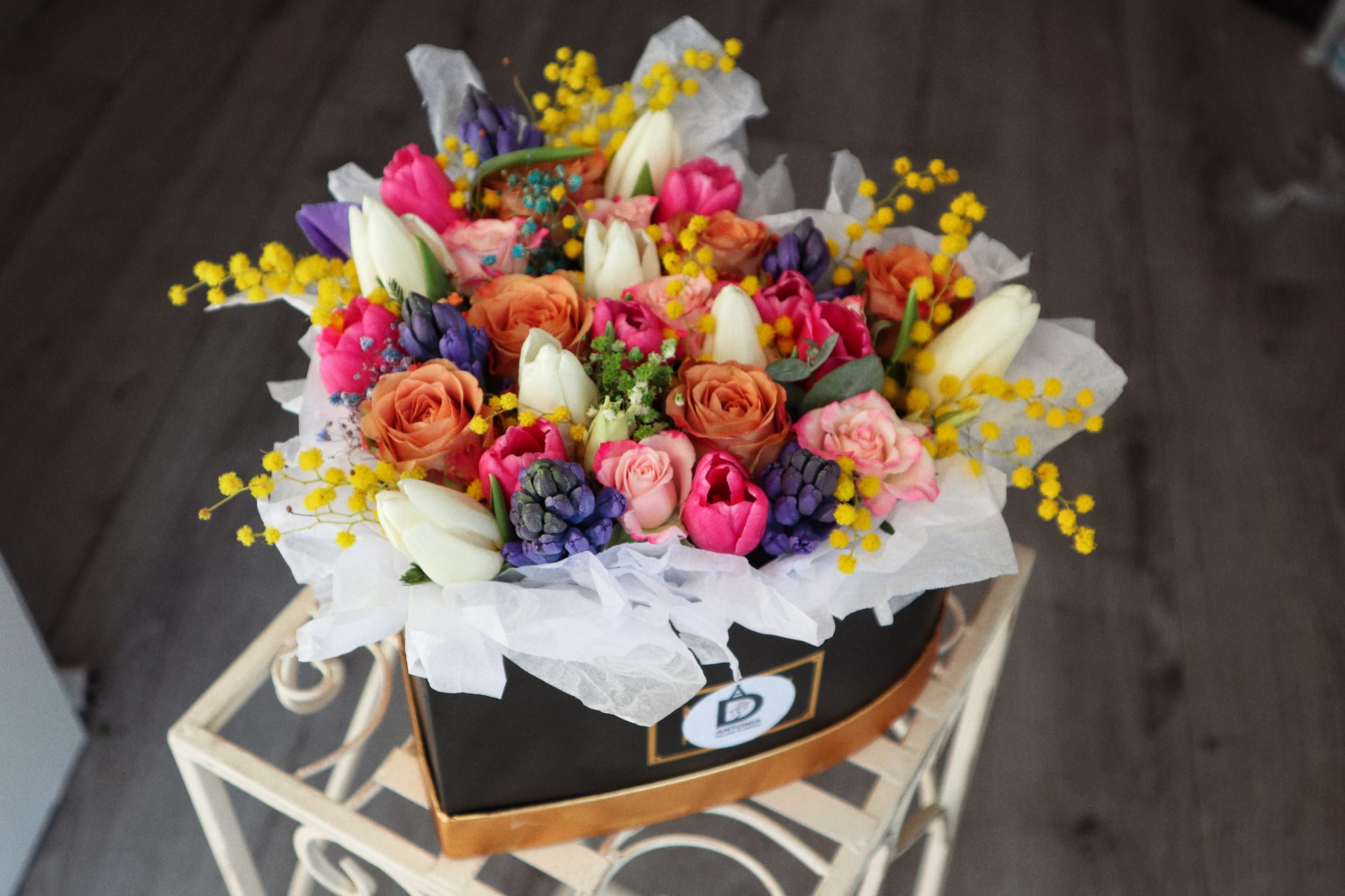 Acest mixt de flori inedit cu trandafiri, zambile, lalele si mimoze adună la un loc flori colorate și parfumate într-o cutie in forma de inimioara elegantă, realizată pentru a bucura inimile celor care primesc acest aranajament de o frumusețe rară.