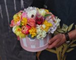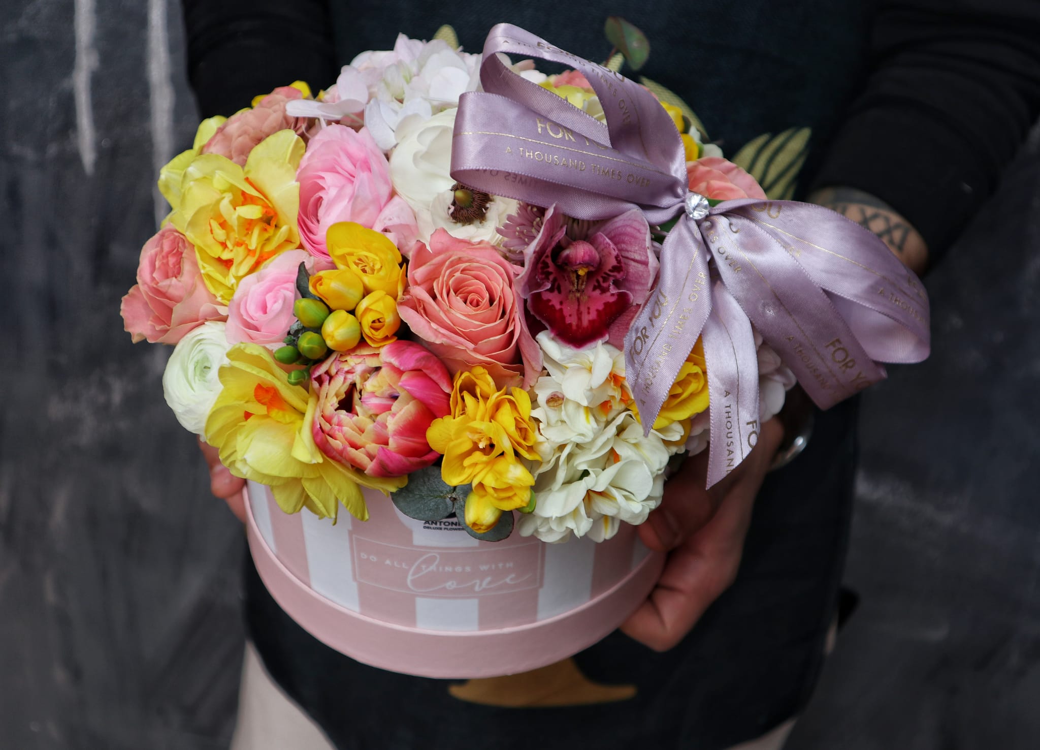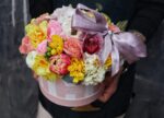Cutie flori de primavara cu flori proasapete, parfumate si colorate pentru a aduce fericire si bucurie persoanei pentru care aceasta cutie a fost creata si daruita. Aceasta cutie de flori delicata contine: trandafiri, narcise, frezii, lalele și alte flori de umplere